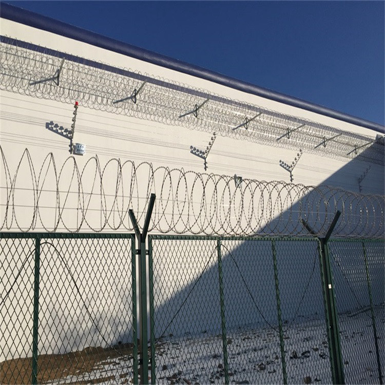 工程案例監(jiān)獄鋼網(wǎng)墻又稱(chēng)作“Y型安全防御護(hù)網(wǎng)”,是由V型支架立柱加強(qiáng)型焊接片網(wǎng),安全防盜連接件和熱鍍鋅刀片刺網(wǎng)組成強(qiáng)度和安全防御性級(jí)別很高。被廣泛應(yīng)用在監(jiān)獄,軍事基地等高安全場(chǎng)所。