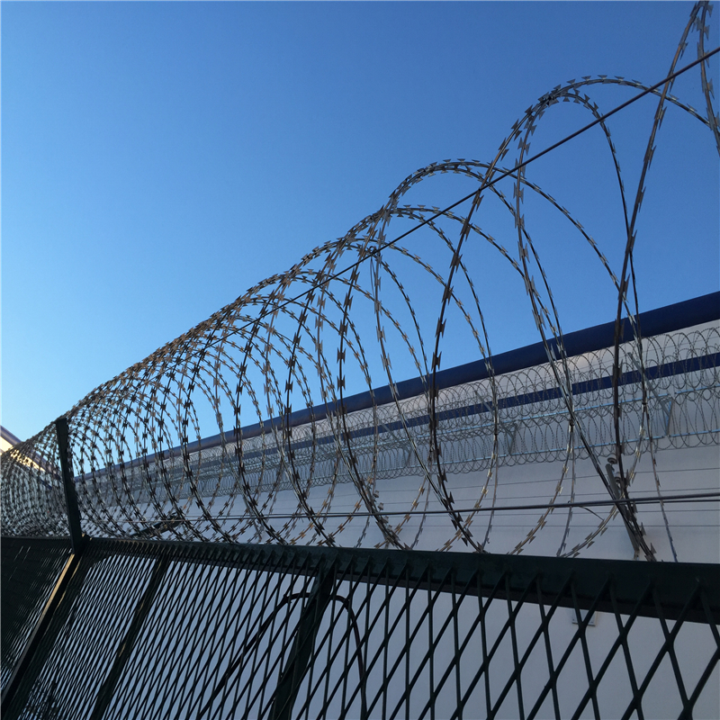此種刀片刺繩一看就令人不寒而栗,在陽光下亮閃閃的泛光,而且因為是金屬的材質,還可以安裝傳感裝置,因而是安全性能極佳的一種安全防護網(wǎng)。這種刀片刺網(wǎng)網(wǎng)身剛硬,不必用張力絲和高技術工人維護,簡易安裝而且維護成本低。刀片刺繩因而在軍事重地,監(jiān)獄,政府機構,銀行,小區(qū)圍墻,別墅圍墻高速路,和邊境線上這些安全性要求高的地方安裝。