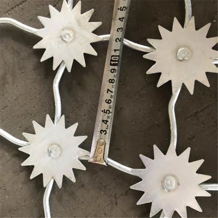 監(jiān)獄梅花刺片隔離網(wǎng)高度3—5米,立柱跨度為2.5米—3米。是由防盜美格網(wǎng)加焊防爬刺片組合而成,美格網(wǎng)的網(wǎng)孔為:100x100mm,110*110mm,絲徑為:5—8mm,刺片直徑50—150mm,形狀似太陽(yáng),四周布滿刺尖。焊接在美格網(wǎng)每一個(gè)交接點(diǎn)處,是由二氧化碳保護(hù)焊進(jìn)行焊接的,網(wǎng)邊框?yàn)?0×30mm、40x60mm、鍍鋅方管,壁厚不得少于1.5mm.然后把焊接打磨好的邊框與網(wǎng)片連接,再經(jīng)過(guò)靜電噴涂就算成品了。梅花刺片隔離網(wǎng)由美格網(wǎng)和梅花刺片(因其外形類似梅花得名)組合而成的阻絕器材。