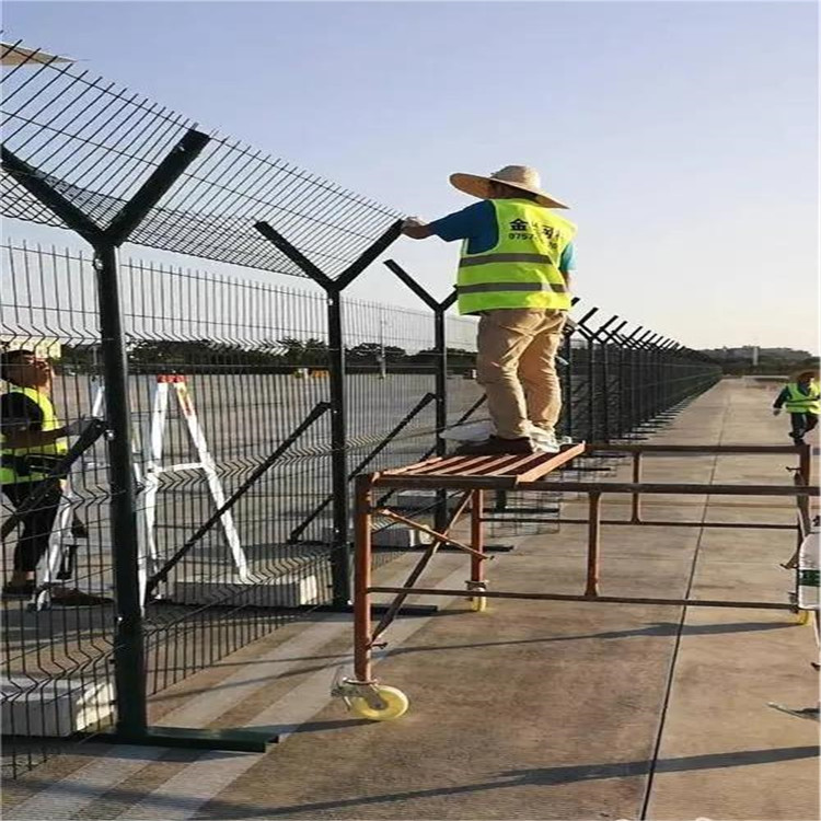 機場圍界又稱作“Y型安全防御護網(wǎng)”,是由折彎網(wǎng)片,V型支架立柱,加強型焊接片網(wǎng),上面有刀片刺繩(又稱刀刺網(wǎng),刀片護網(wǎng))安全防盜連接件組成強度和安全防御性級別很高。被廣泛應用在機場,飛行基地等安全場所。因立柱外形酷似英文字母Y,所以被稱為Y型安全防御護網(wǎng)。頂部加裝刀片刺絲、刀片刺網(wǎng)后又很好的增強了安全防護性能。產(chǎn)品造型美觀、花色多樣,既起到圍欄作用,又起到美化作用。由于具有安全性高、防攀爬能力好,網(wǎng)片連接方式采用特制SBS緊扣件,有效防止人為的破壞性拆卸,橫向2-4道折彎加強筋,使網(wǎng)面強度增加,每6米增加一根斜撐,這樣防風性能也加強了。