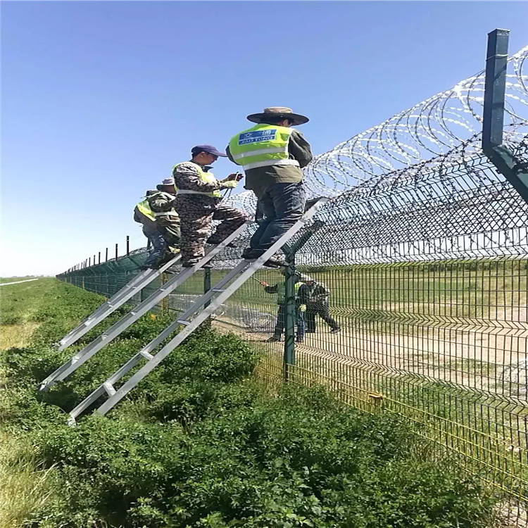 標準機場圍界采用直徑5.0mm鍍鋅絲焊接,可直接采用噴塑作為表面處理,常見顏色為綠色。網(wǎng)孔50mm*100mm,50*200mm,也可根據(jù)要求定做。立柱為60X60的矩形鋼或圓管立柱,頂端焊有V型支架,也可采用70mmX100mm的掛式連接立柱。產(chǎn)品均為熱鍍鋅后采用高質(zhì)量的聚酯粉末靜電噴涂,采用國際流行的RAL顏色。連接方式主要使用M卡,抱卡連接。具有美觀、實用、方便運輸和安裝的特點,安裝時還能適應(yīng)地形,與立柱連接位隨地面起伏可上下調(diào)整。