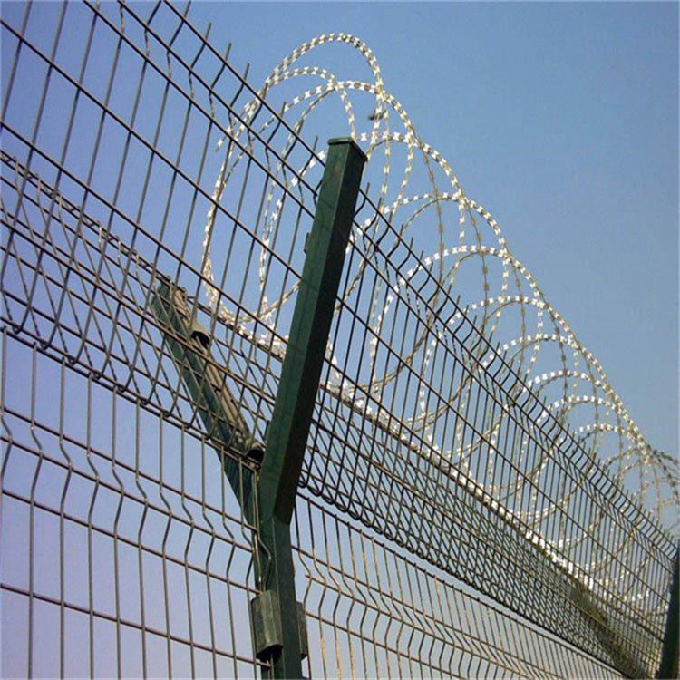 機場圍界和監(jiān)獄隔離網(wǎng)又稱作“Y型安全防御護網(wǎng)”,都是由折彎網(wǎng)片,V型支架立柱,加強型焊接片網(wǎng),上面有刀片刺繩(又稱刀刺網(wǎng),刀片護網(wǎng))安全防盜連接件組成強度和安全防御性級別很高。因立柱外形酷似英文字母Y,所以被稱為Y型安全防御護網(wǎng)。頂部加裝刀片刺絲、刀片刺網(wǎng)后又很好的增強了安全防護性能。產(chǎn)品造型美觀、花色多樣,既起到圍欄作用,又起到美化作用。由于具有安全性高、防攀爬能力好,網(wǎng)片連接方式采用特制SBS緊扣件,有效防止人為的破壞性拆卸,橫向2-4道折彎加強筋,使網(wǎng)面強度增加,每6米增加一根斜撐,這樣防風性能也加強了。