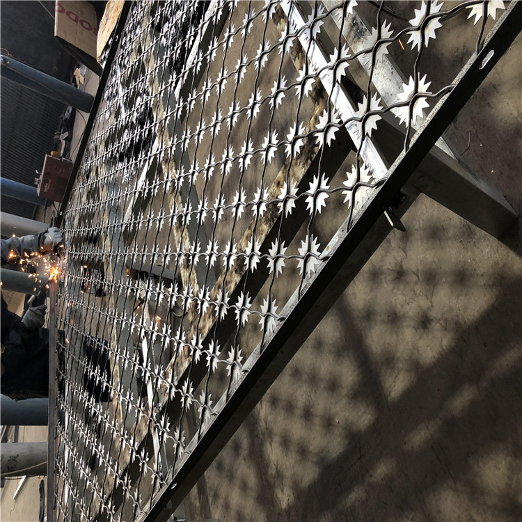 工程案例監(jiān)獄梅花刺片隔離網(wǎng)一改往常鋼網(wǎng)墻長方形的網(wǎng)孔形式,采用菱形孔的美格網(wǎng)網(wǎng)片,在網(wǎng)片的每個截點焊接梅花形刺片,因其特珠的外形,相較于之前的普通鋼網(wǎng)墻,無法采取腳踩、手握的方式翻越,防攀吧性能、安全性能有所增加。表面處理多采取熱鍍鋅的形式,也有要求較高的地方采用不銹鋼材質(zhì)的鋼網(wǎng)墻,防腐蝕效果更佳。故而已被越來越多的監(jiān)獄、看守所、邊防線等單位使用。