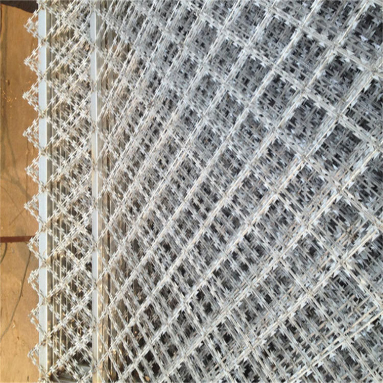 刀片刺繩是沖剪鋼板成銳利的尖刀帶子,然后包裹中碳鋼絲(筋絲)之上。刀片刺絲是從海外引進(jìn)的絕對禁止通過的新型隔離產(chǎn)品。鋒利的刀片刺絲由雙根線扣卡子組裝后成蛇腹?fàn)?,讓人看到不寒而粟,能夠起到了恐嚇作用,實際上人挨上刀片刺絲就被劃破,實際效果明顯。該產(chǎn)品施工便利便捷。深受軍隊和警察喜好。各國已將刀片刺網(wǎng)廣泛用于飛機(jī)場、軍事重地、邊境線、監(jiān)獄、政府機(jī)關(guān)、銀行,以及別墅的圍墻、高速公路、鐵路護(hù)欄等地。