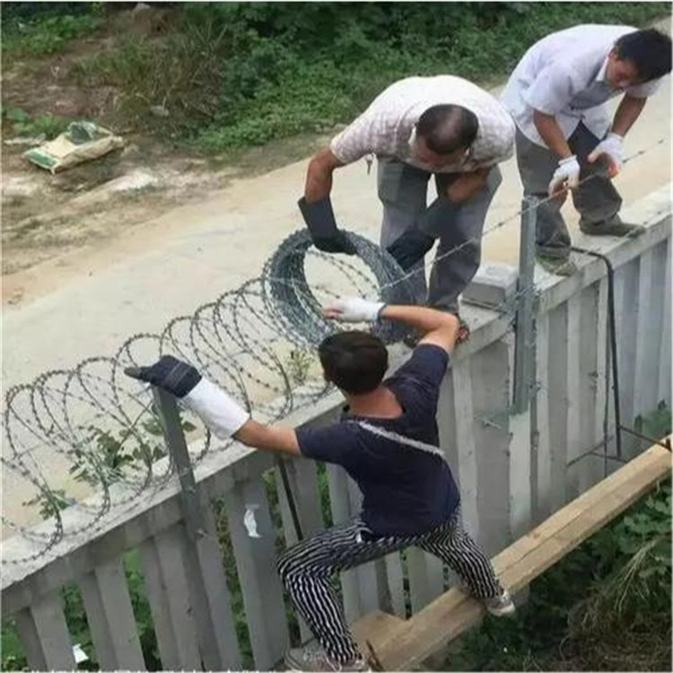 在鐵路上因?yàn)殍F路沿線都比較長所以都會用一下比較廉價(jià)的水泥墻來作為圍墻,但是也因?yàn)樗鄩Φ暮裰?,所以做的都不會很高還是會有人或動物翻越的危險(xiǎn)。所以在安全防御方面,就應(yīng)生了刀刺網(wǎng)這種產(chǎn)品,南方人喜歡叫刺絲滾籠,北方人喜歡叫刀刺網(wǎng),也有很多其他叫法,如:蛇腹形(型)刀刺網(wǎng) 滾刀刺,刺刀圈,那它有很多種型號,用在鐵路刺絲滾籠常用的材質(zhì):熱浸鋅和不銹鋼,型號:BTO-22,芯線:常用2.5mm,厚度:0.5mm,刀片長度:22mm,寬度:15mm,刀片間距:34mm,圈徑500mm,如果是陰雨多的地方建議選擇不銹鋼刀刺網(wǎng)材質(zhì),其他地方熱浸鋅的就可以。另外關(guān)于安裝密度問題,我們一般都是按照鐵路相關(guān)文件要求,一米不低于10圈的安裝標(biāo)準(zhǔn)來核算成本,如果允許調(diào)整密度,則價(jià)格也會隨之變動。