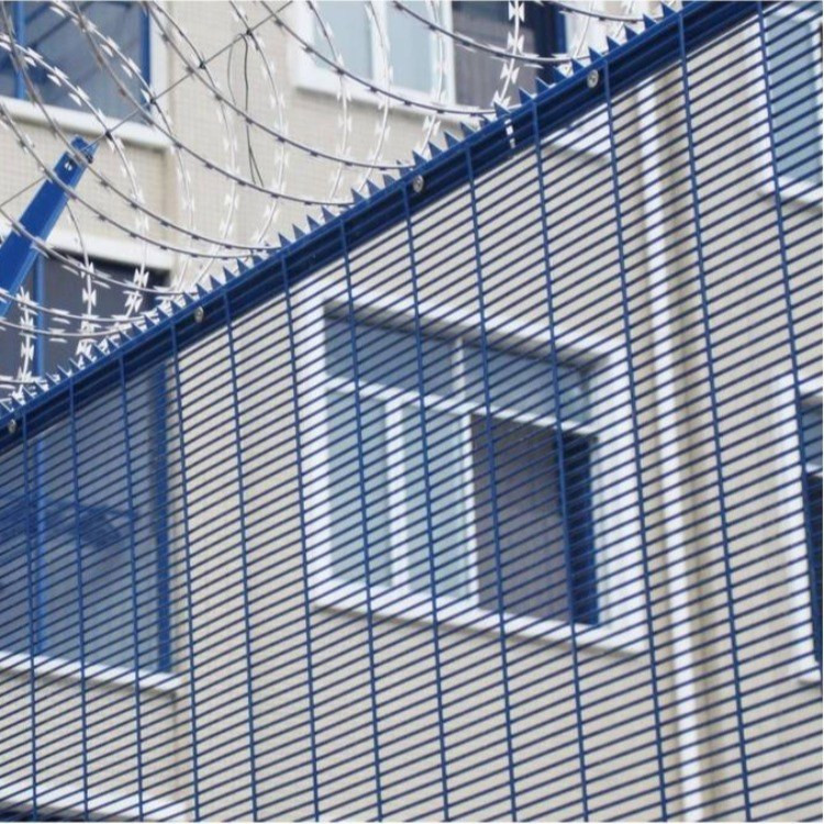 監(jiān)獄358密紋網(wǎng)安裝方法:1.先將立柱下端的法蘭盤與基座內(nèi)預(yù)埋螺栓固定連接,立柱排列完畢之后進(jìn)行監(jiān)獄護(hù)欄網(wǎng)片的安裝。2.網(wǎng)片的連接采用M12x40mm防拆卸螺栓與立柱連接,每個網(wǎng)片與立柱的連接至少用6個防拆卸螺栓,兩側(cè)各3個,網(wǎng)片底端距離地面50mm。3.網(wǎng)片固定完畢后,安裝人員通過搭設(shè)腳手架將中800mm的刀片刺網(wǎng)連接到立柱頂端的V型架上,刀片刺網(wǎng)水平拉伸間距150-200mm,刀片刺網(wǎng)底部與隔離網(wǎng)片上沿之間間距不大于10mm。在刀片刺網(wǎng)圈里面均勻拉伸6根(3對)93mm的304不銹鋼絲繩,刀片刺網(wǎng)與不銹鋼絲繩之間用不銹鋼卡固定,每個網(wǎng)片至少有6個不銹鋼卡。
