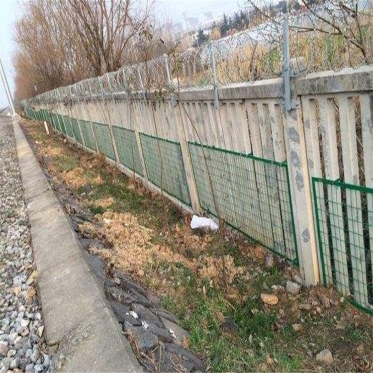 高鐵上面用的刀片刺繩用的是直徑500毫米的,拉開間距為20公分,0.5m絲資龍支架和加密支架采用30*50*2.0短形鋼管制作,表面進(jìn)行熱鍍鋅處理,鍍鋅量270g/??v向拉筋兩道,后安裝刀刺滾籠,通過卡扣連接在縱向拉筋上,從而形成高鐵防護(hù)柵欄加高刺絲滾籠成品。
