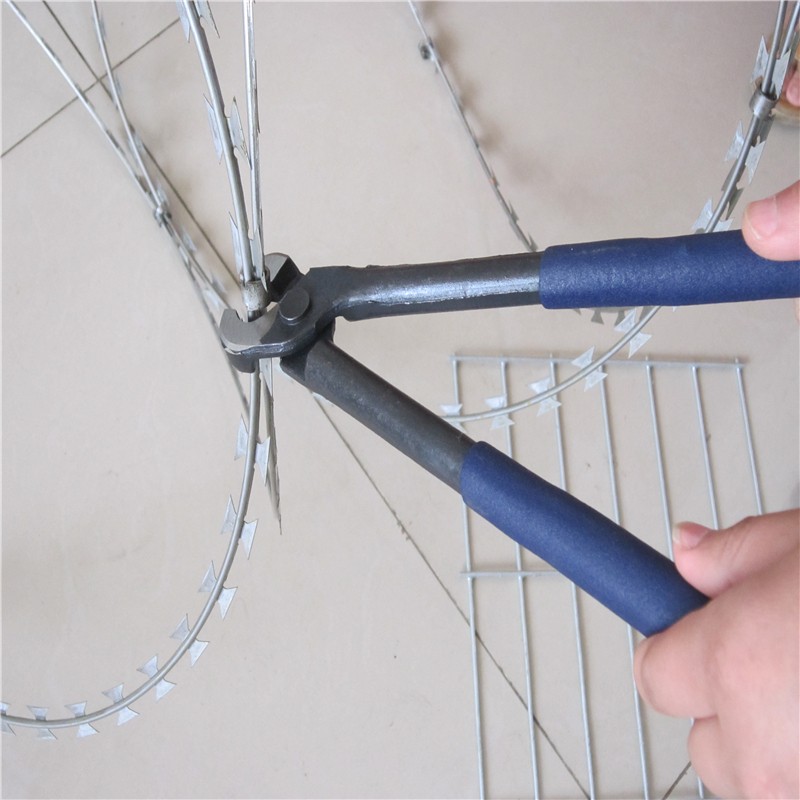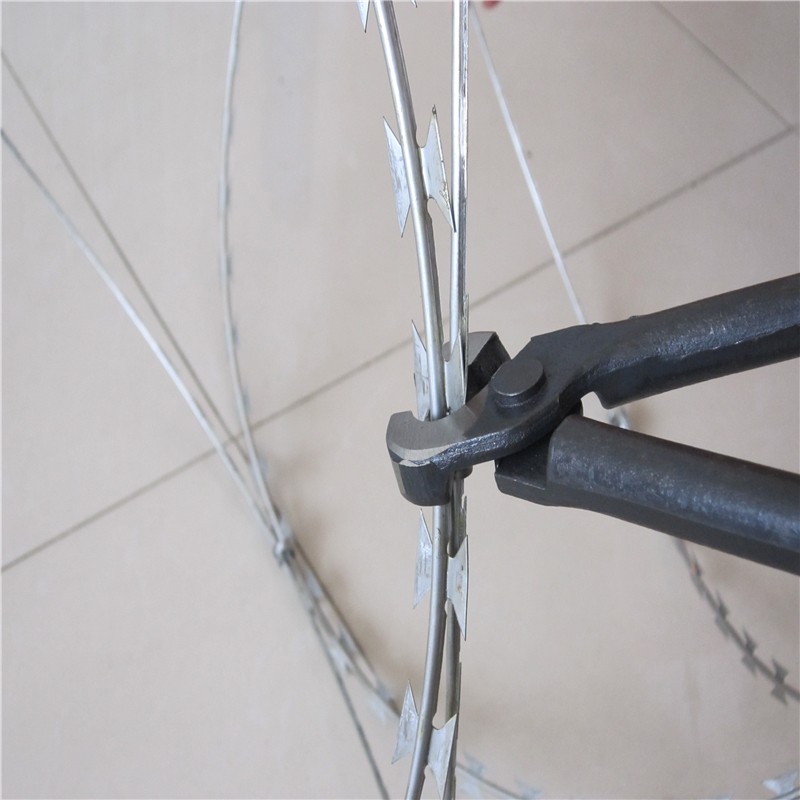 平板式刀片刺繩護(hù)欄網(wǎng)是刀片刺繩護(hù)欄網(wǎng)的一種新的應(yīng)用方式,它是將單圈式刀片刺繩平壓成板狀,或?qū)杉稳Υ汤K壓平后交叉相錯(cuò)使用,外表美觀而且實(shí)用,可與直線式刀片刺網(wǎng)搭配使用,構(gòu)成下直線上平板的防護(hù)墻,或僅用平板式刺網(wǎng)構(gòu)成防護(hù)墻。