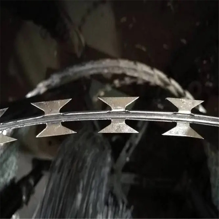 新聞動(dòng)態(tài)刀片刺網(wǎng)由沖切鋼板采用機(jī)械壓軋?jiān)阡摻z上成型,刀刺寬度22mm,兩刃垂直間距15mm,刀刺縱向間距34mm,芯絲直徑為2.5mm。刀片采用厚度0.5mm的Q195鋼板沖切制作,芯絲由HPB300?6.5mm高線鋼絲加工。