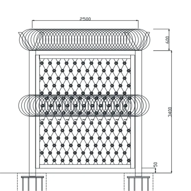 梅花刺片隔離網(wǎng)是由美格網(wǎng)加焊梅花刺片(因其外形類(lèi)似梅花得名)組合而成的阻絕器材,又叫太陽(yáng)花刺片鋼網(wǎng)墻。由于梅花刺片隔離網(wǎng)造形獨(dú)特不易觸摸,因而能達(dá)到很好的防護(hù)隔離效果,既美觀又讓人不寒而粟,起到了很好的阻嚇作用。頂部加蛇腹型刀刺網(wǎng),可以用304不銹鋼材質(zhì),雙重防護(hù),可以有效防止非法分子翻越攀爬。美格網(wǎng)的網(wǎng)孔般為:100x100mm,110*110mm,絲徑為:5—8mm,刺片直徑75mm,形狀似太陽(yáng),四周布滿刺尖。焊接在美格網(wǎng)每一個(gè)交接點(diǎn)處,是由二氧化碳保護(hù)焊進(jìn)行焊接的。下圖為梅花刺片隔離網(wǎng)圖紙參考:高度3400mm*立柱中心距2500mm*厚3.0mm,按圖制作,上裝600mm圈徑的304不繡鋼滾刺網(wǎng)。邊框?yàn)?0×50mm方管或50*5mm角鋼,然后把焊接打磨好的邊框與網(wǎng)片連接。