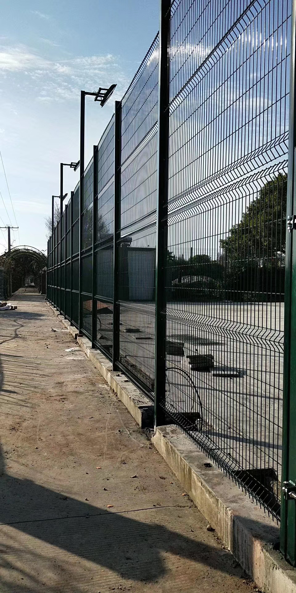 機場圍界網常用的兩種結構就是雙邊絲的和框架的,這兩種結構的除開框架護欄網的邊框規(guī)格其他的基本都是相同的規(guī)格。常用高度為2.0m,大高度可做2.4m;柱中到柱中的距離一般為3m;折彎的都采用的是頂部30公分30度角的折彎,立柱多采用60*60*3mm方管;網孔大小通常為50*100mm;塑后絲徑范圍:5.0-6.5mm。機場圍界又稱作“Y型安全防御護網”,是由V型支架立柱,加強型焊接片網,安全防盜連接件和熱鍍鋅刀片刺籠組成強度和安全防御性級別很高。近年來,被廣泛應用在機場,軍事基地等高安全場所。注:如果在機場圍界頂部加裝刀片刺絲、刀片刺繩后又很好的增強了安全防護性能。