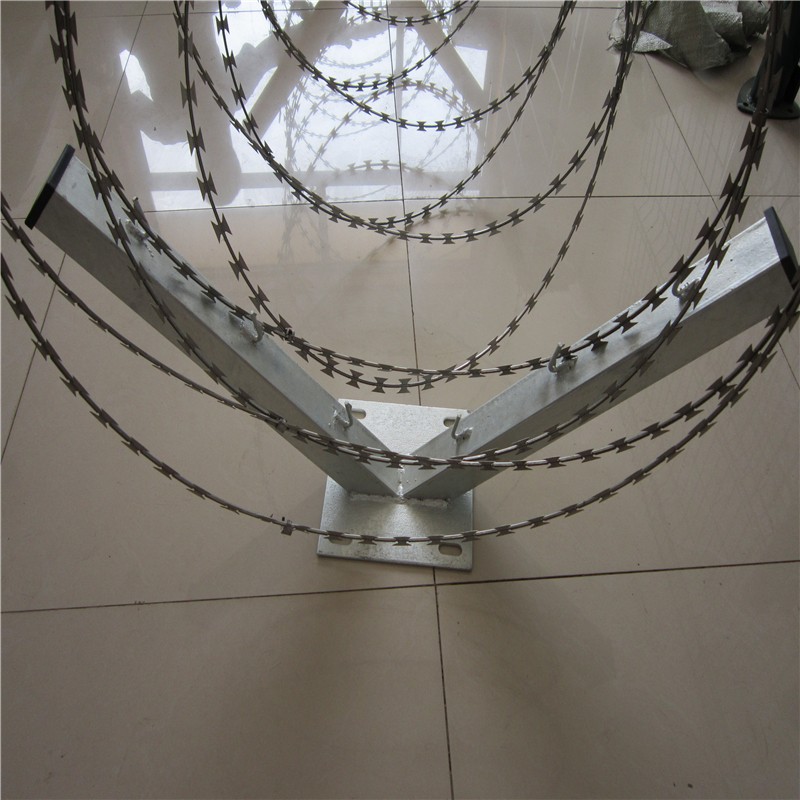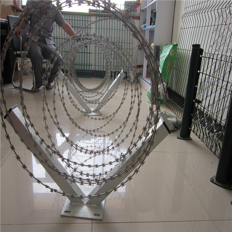 刀片刺繩護(hù)欄網(wǎng)是一種近年發(fā)展起來(lái)的防護(hù)、隔離能力較強(qiáng)的新型防護(hù)網(wǎng)產(chǎn)品。它采用鋼板沖壓成型包附于熱鍍鋅鋼絲(筋絲)之上,由銳利尖角鍍鋅鋼板或不銹鋼薄板做刀片,高張力鋼絲做芯線組合而成的。鋒利的刀型刺由雙線扣裝后成蛇腹?fàn)?,既美觀又讓人不寒而栗。起到了很好的阻嚇作用。