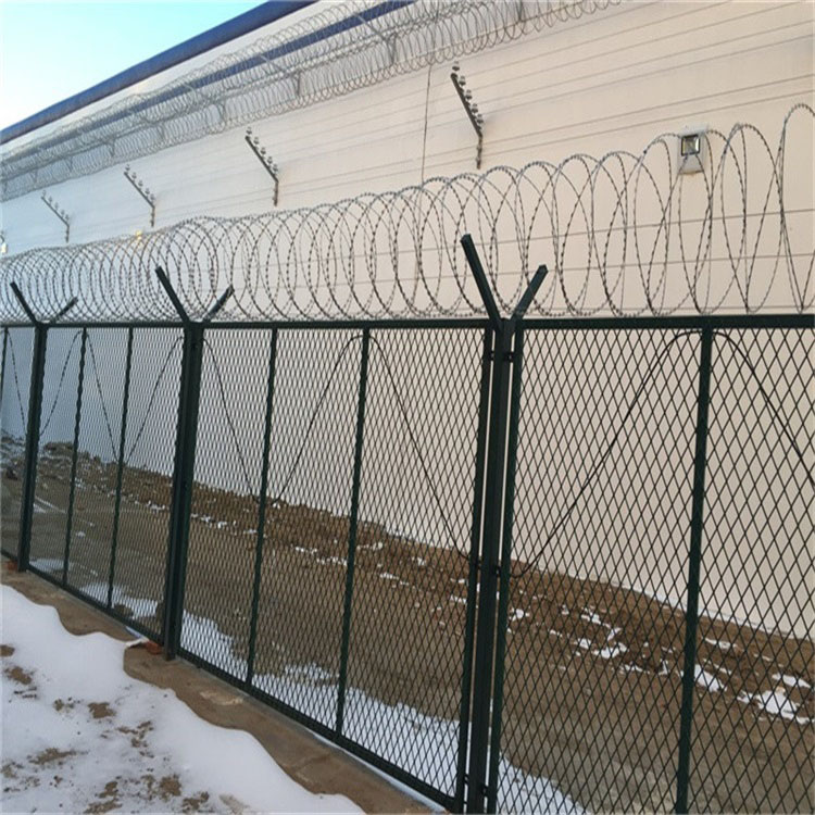 監(jiān)獄隔離網(wǎng)立柱間距為3米,邊框?yàn)?0X30mm或者30X50mm的鋼管,網(wǎng)孔為:70x150mm、50X100mm、60X120mm等,絲徑為:4mm-6mm;立柱規(guī)格為:60X60mm、80X80mm、100X100mm方柱,V字高度為:50cm,立柱壁厚: 2mm-3.5mm;整體全部采用鍍鋅材質(zhì)浸塑或者靜電噴涂。連接方式網(wǎng)片邊框打孔。立柱焊接邊耳用鍍鋅或不銹鋼螺絲連接。監(jiān)獄隔離網(wǎng)立柱頂部加焊V型網(wǎng)片,用來支撐蛇腹型刀刺網(wǎng),這樣組裝起來的監(jiān)獄隔離網(wǎng)堅(jiān)不可摧。