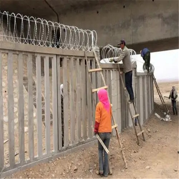 刺絲滾籠安裝工人一定要戴好專用手套,防止被刺絲滾籠扎破。工人不要年齡太大,防止從水泥柵欄上面滑落,造成人員傷亡。安裝刺絲滾籠時一-定要做到“"嚴直齊美、 間距均勻”美觀和防護的雙結(jié)合。刺絲連接卡的位置,施工中 ,首先要把縱向拉筋拉直,兩道拉筋成平行狀態(tài);均勻的把刺絲滾籠分開,固定加密支架,隨后加固刺絲連接卡。