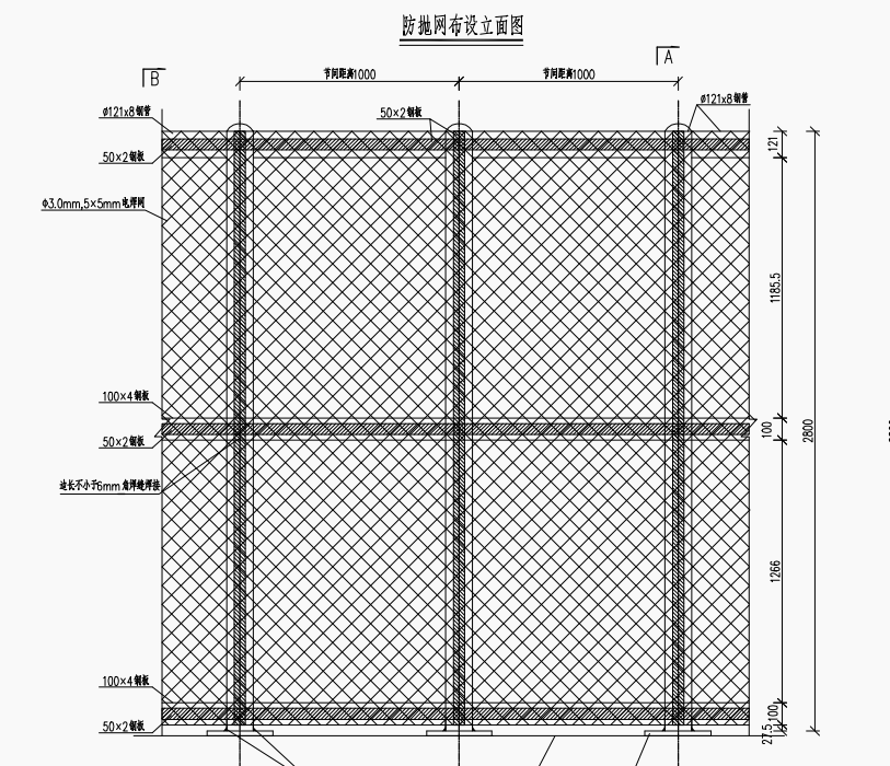 3.防批網(wǎng)網(wǎng)片應(yīng)選用冷拔低碳鋼絲制作,網(wǎng)絲直徑3mm,網(wǎng)孔5x5mm