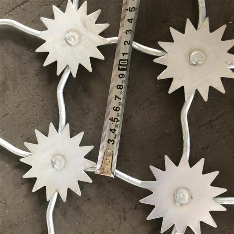 新聞動(dòng)態(tài)1、梅花刺片護(hù)欄網(wǎng)又名太陽花刺片隔離網(wǎng),為太陽的后裔單層梅花刺片網(wǎng),直徑不小于7.5cm,刺片厚1.5mm,采用Q235低碳鋼板沖壓成型。