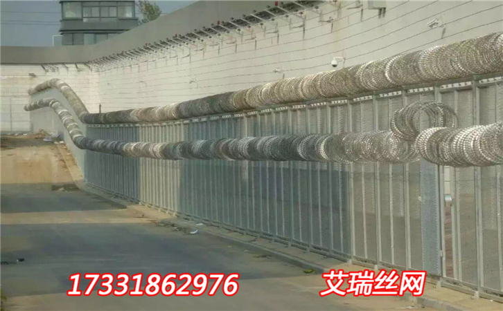 監(jiān)獄鋼網(wǎng)墻是一種新型防護(hù)網(wǎng),由銳利尖角鍍鋅鋼板或不銹鋼薄板做刀片,鋼絲做芯線組合而成的防護(hù)器材. 監(jiān)獄鋼網(wǎng)墻刀片刺網(wǎng)具有嚇阻、防翻越等效果,材質(zhì)堅(jiān)硬,高強(qiáng)度,高張力,造型設(shè)計(jì)獨(dú)特,不宜觸摸,因而能達(dá)到極好的防護(hù)隔離效果.