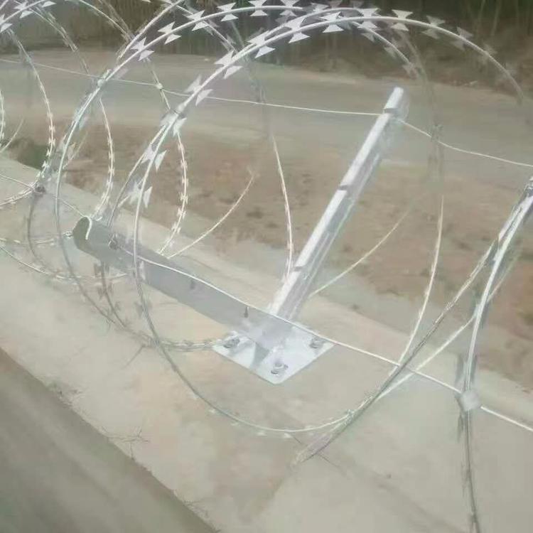 刀片刺繩也稱為刀片刺絲、刀片刺網(wǎng),是一種新型護(hù)欄網(wǎng)產(chǎn)品。它具有嚇阻、防攀爬作用,效果好、美觀、施工便利,經(jīng)濟(jì)實用等優(yōu)異特點。主要用于監(jiān)獄、機(jī)場、哨所、邊防、園林公寓、機(jī)關(guān)單位等的圈禁防護(hù)。刀片刺網(wǎng)由熱鍍鋅鋼板或不銹鋼薄板沖壓出尖銳的刀片狀,高張力鍍鋅鋼絲或者不銹鋼絲做芯線組合而成的阻絕器材。由于刺網(wǎng)造形獨特不易觸摸,因而能達(dá)到極好的防護(hù)隔離效果。產(chǎn)品的主要材質(zhì)有鍍鋅板和不銹鋼板。