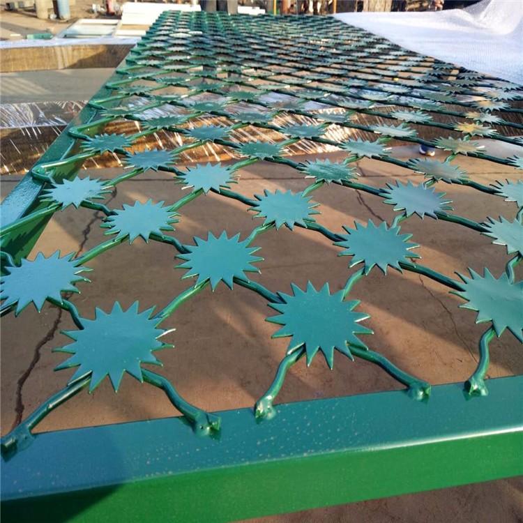 1、梅花刺片護(hù)欄網(wǎng)又名太陽(yáng)花刺片隔離網(wǎng),為太陽(yáng)的后裔單層梅花刺片網(wǎng),直徑不小于7.5cm,刺片厚1.5mm,采用Q235低碳鋼板沖壓成型。